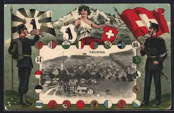 AK Teufen, Ortsansicht und Rahmen mit Schweizer Soldaten und Helvetia