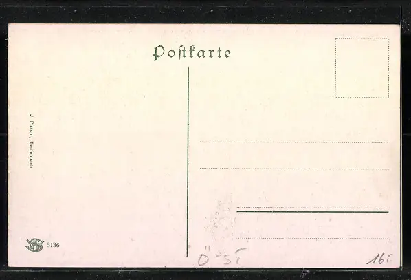 Personenbezogene Daten auf der Rückseite der Karte wurden durch blauen Textmarker unkenntlich gemacht. Die blauen Stellen sind auf die Vorderseite durchgeweicht und wirken sich negativ auf das Postkartenfoto aus