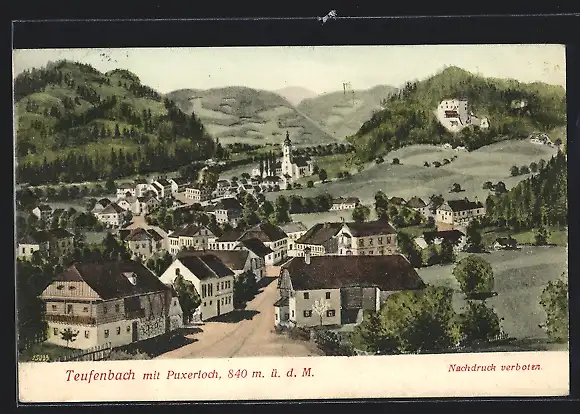 AK Teufenbach, Ortsansicht mit Kirche & Puxerloch aus der Vogelschau