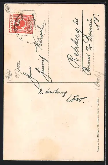 Personenbezogene Daten auf der Rückseite der Karte wurden durch blauen Textmarker unkenntlich gemacht. Die blauen Stellen sind auf die Vorderseite durchgeweicht und wirken sich negativ auf das Postkartenfoto aus