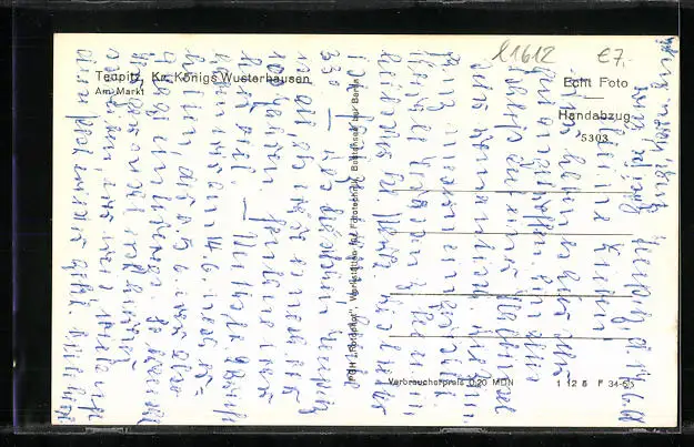 Personenbezogene Daten auf der Rückseite der Karte wurden durch blauen Textmarker unkenntlich gemacht. Die blauen Stellen sind auf die Vorderseite durchgeweicht und wirken sich negativ auf das Postkartenfoto aus