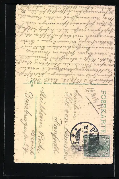 Personenbezogene Daten auf der Rückseite der Karte wurden durch blauen Textmarker unkenntlich gemacht. Die blauen Stellen sind auf die Vorderseite durchgeweicht und wirken sich negativ auf das Postkartenfoto aus