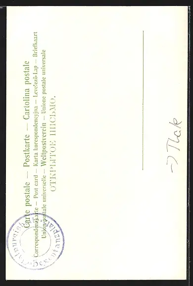 Personenbezogene Daten auf der Rückseite der Karte wurden durch blauen Textmarker unkenntlich gemacht. Die blauen Stellen sind auf die Vorderseite durchgeweicht und wirken sich negativ auf das Postkartenfoto aus