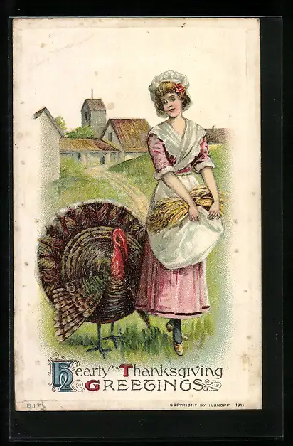 AK Thanksgiving, Bäuerin und Truthahn auf einem Feld
