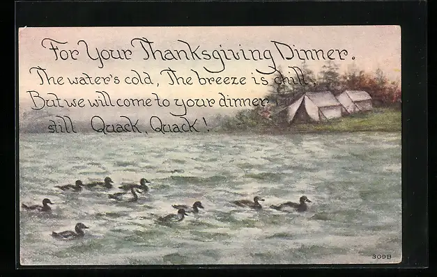 AK Thanksgiving, Enten auf einem See, Zelte am Ufer