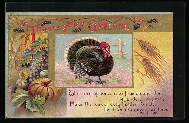 AK Thanksgiving Greeting, Truthahn im Ernte-Passepartout