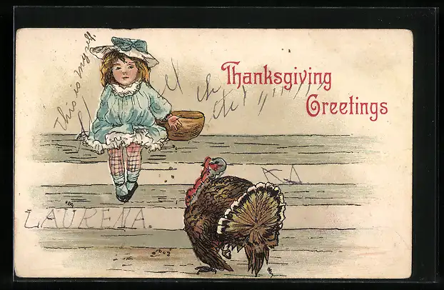 AK Thanksgiving Greetings, Kleines Mädchen beobachtet einen Truthahn