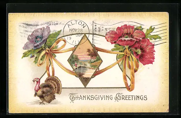 AK Thanksgiving Greetings, Truthahn mit Herbstlandschaft und Blüten