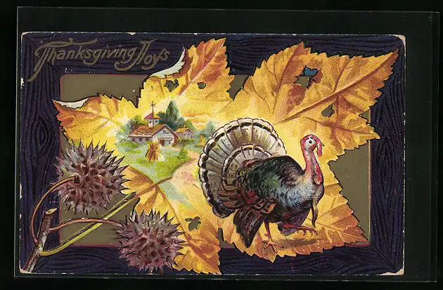 AK Thanksgiving Joys, Truthahn auf einem Herbstblatt