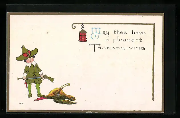 AK Thanksgiving, Kleiner Pilger mit erlegtem Truthahn