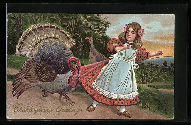 AK Thanksgiving, Mädchen und Truthahn auf einem Feldweg
