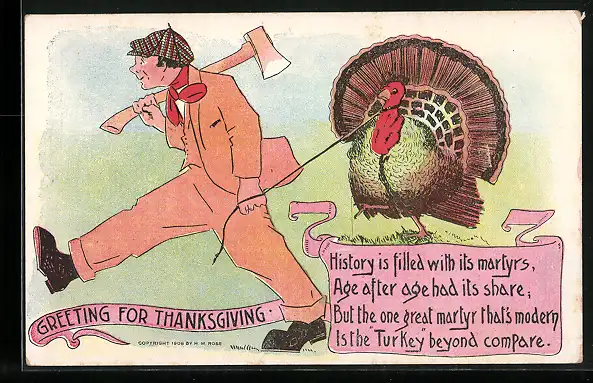 AK Thanksgiving, Mann mit Axt führt einen Truthahn am Seil