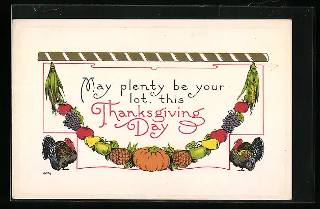 AK Thanksgiving, Truthähne und eine Girlande aus Früchten