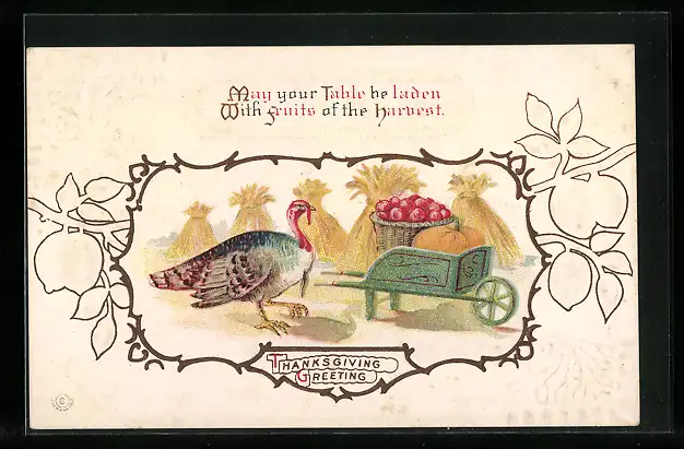 AK Thanksgiving, Truthahn mit Kürbis und Äpfeln