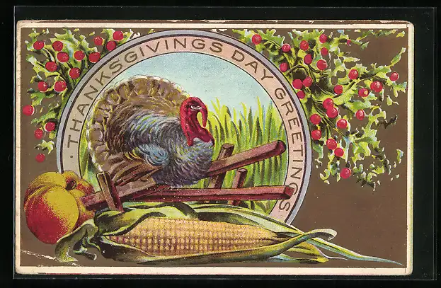 AK Thanksgiving, Truthahn mit Maiskolben, Kürbis und Apfelbaum