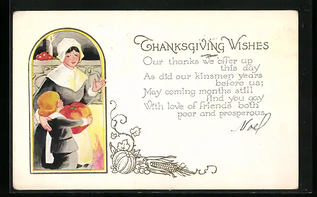 AK Thanksgiving Wishes, Mutter und Kind mit einem Kürbis