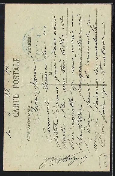 Personenbezogene Daten auf der Rückseite der Karte wurden durch blauen Textmarker unkenntlich gemacht. Die blauen Stellen sind auf die Vorderseite durchgeweicht und wirken sich negativ auf das Postkartenfoto aus