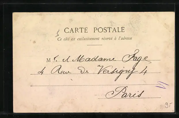 Personenbezogene Daten auf der Rückseite der Karte wurden durch blauen Textmarker unkenntlich gemacht. Die blauen Stellen sind auf die Vorderseite durchgeweicht und wirken sich negativ auf das Postkartenfoto aus