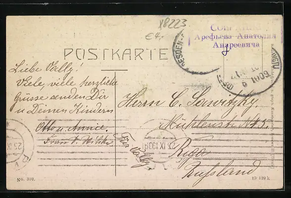 Personenbezogene Daten auf der Rückseite der Karte wurden durch blauen Textmarker unkenntlich gemacht. Die blauen Stellen sind auf die Vorderseite durchgeweicht und wirken sich negativ auf das Postkartenfoto aus