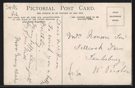 Personenbezogene Daten auf der Rückseite der Karte wurden durch blauen Textmarker unkenntlich gemacht. Die blauen Stellen sind auf die Vorderseite durchgeweicht und wirken sich negativ auf das Postkartenfoto aus