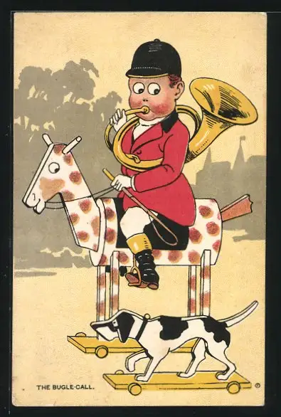 AK The Bugle-Call, Jäger auf Holzpferd ruft seinen Hund per Horn
