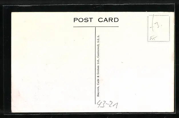 Personenbezogene Daten auf der Rückseite der Karte wurden durch blauen Textmarker unkenntlich gemacht. Die blauen Stellen sind auf die Vorderseite durchgeweicht und wirken sich negativ auf das Postkartenfoto aus