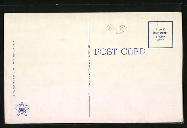 Personenbezogene Daten auf der Rückseite der Karte wurden durch blauen Textmarker unkenntlich gemacht. Die blauen Stellen sind auf die Vorderseite durchgeweicht und wirken sich negativ auf das Postkartenfoto aus