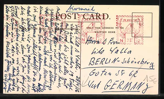 Personenbezogene Daten auf der Rückseite der Karte wurden durch blauen Textmarker unkenntlich gemacht. Die blauen Stellen sind auf die Vorderseite durchgeweicht und wirken sich negativ auf das Postkartenfoto aus