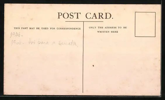 Personenbezogene Daten auf der Rückseite der Karte wurden durch blauen Textmarker unkenntlich gemacht. Die blauen Stellen sind auf die Vorderseite durchgeweicht und wirken sich negativ auf das Postkartenfoto aus