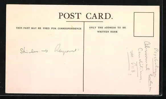 Personenbezogene Daten auf der Rückseite der Karte wurden durch blauen Textmarker unkenntlich gemacht. Die blauen Stellen sind auf die Vorderseite durchgeweicht und wirken sich negativ auf das Postkartenfoto aus