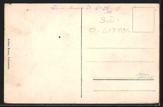 Personenbezogene Daten auf der Rückseite der Karte wurden durch blauen Textmarker unkenntlich gemacht. Die blauen Stellen sind auf die Vorderseite durchgeweicht und wirken sich negativ auf das Postkartenfoto aus
