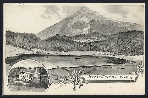 AK Thiersee, Ortspartie mit Turm, Thiersee mit Pendling