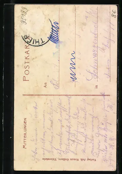 Personenbezogene Daten auf der Rückseite der Karte wurden durch blauen Textmarker unkenntlich gemacht. Die blauen Stellen sind auf die Vorderseite durchgeweicht und wirken sich negativ auf das Postkartenfoto aus