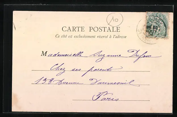 Personenbezogene Daten auf der Rückseite der Karte wurden durch blauen Textmarker unkenntlich gemacht. Die blauen Stellen sind auf die Vorderseite durchgeweicht und wirken sich negativ auf das Postkartenfoto aus