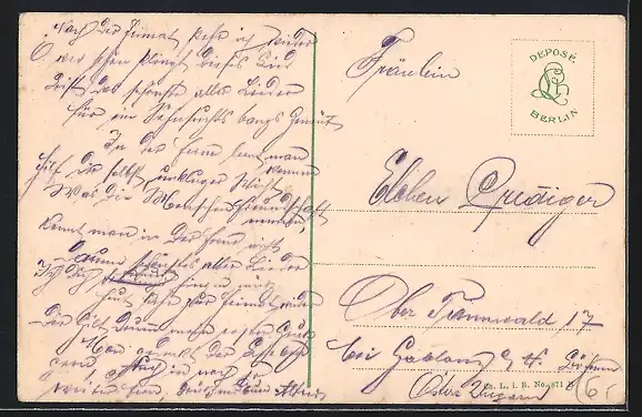 Personenbezogene Daten auf der Rückseite der Karte wurden durch blauen Textmarker unkenntlich gemacht. Die blauen Stellen sind auf die Vorderseite durchgeweicht und wirken sich negativ auf das Postkartenfoto aus