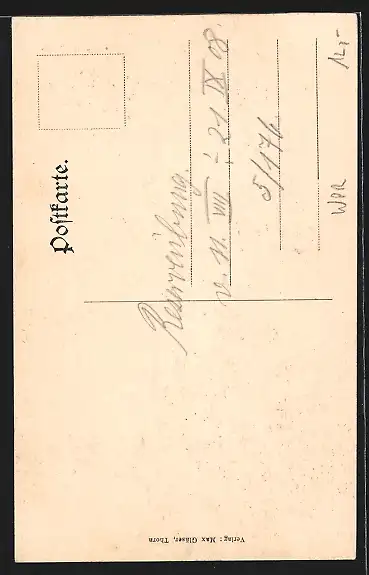 Personenbezogene Daten auf der Rückseite der Karte wurden durch blauen Textmarker unkenntlich gemacht. Die blauen Stellen sind auf die Vorderseite durchgeweicht und wirken sich negativ auf das Postkartenfoto aus
