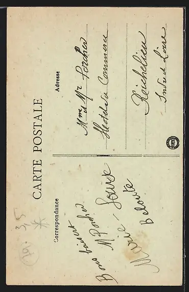 Personenbezogene Daten auf der Rückseite der Karte wurden durch blauen Textmarker unkenntlich gemacht. Die blauen Stellen sind auf die Vorderseite durchgeweicht und wirken sich negativ auf das Postkartenfoto aus