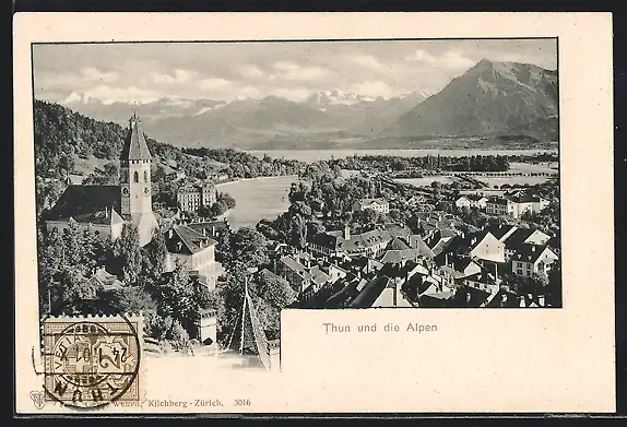 AK Thun, Ortsansicht und der Blick in die Alpen