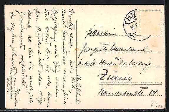 Personenbezogene Daten auf der Rückseite der Karte wurden durch blauen Textmarker unkenntlich gemacht. Die blauen Stellen sind auf die Vorderseite durchgeweicht und wirken sich negativ auf das Postkartenfoto aus