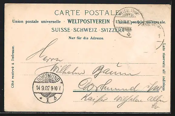 alte Ansichtskarte, gelaufen 1902, Briefmarke entfernt, rückseitig Oberflächenschaden, guter Zustand