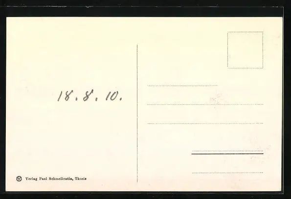 Personenbezogene Daten auf der Rückseite der Karte wurden durch blauen Textmarker unkenntlich gemacht. Die blauen Stellen sind auf die Vorderseite durchgeweicht und wirken sich negativ auf das Postkartenfoto aus