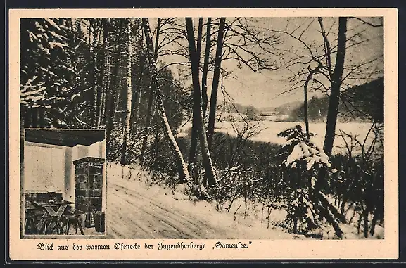 AK Tiefensee / Mark, Blick aus der warmen Ofenecke der Jugendherberge Gamensee
