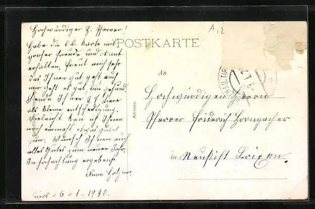Personenbezogene Daten auf der Rückseite der Karte wurden durch blauen Textmarker unkenntlich gemacht. Die blauen Stellen sind auf die Vorderseite durchgeweicht und wirken sich negativ auf das Postkartenfoto aus