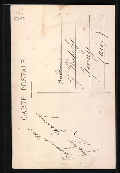 Personenbezogene Daten auf der Rückseite der Karte wurden durch blauen Textmarker unkenntlich gemacht. Die blauen Stellen sind auf die Vorderseite durchgeweicht und wirken sich negativ auf das Postkartenfoto aus