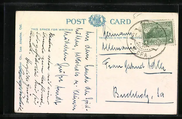 Personenbezogene Daten auf der Rückseite der Karte wurden durch blauen Textmarker unkenntlich gemacht. Die blauen Stellen sind auf die Vorderseite durchgeweicht und wirken sich negativ auf das Postkartenfoto aus