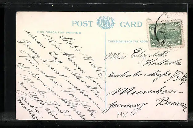 Personenbezogene Daten auf der Rückseite der Karte wurden durch blauen Textmarker unkenntlich gemacht. Die blauen Stellen sind auf die Vorderseite durchgeweicht und wirken sich negativ auf das Postkartenfoto aus