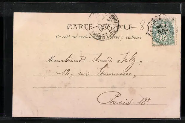 Personenbezogene Daten auf der Rückseite der Karte wurden durch blauen Textmarker unkenntlich gemacht. Die blauen Stellen sind auf die Vorderseite durchgeweicht und wirken sich negativ auf das Postkartenfoto aus