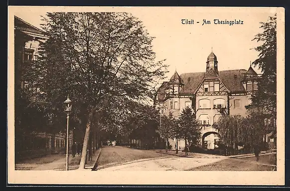 AK Tilsit, Am Thesingplatz, Strassenpartie mit Turmgebäude