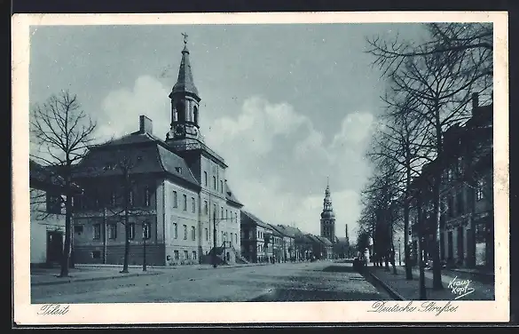 AK Tilsit, Deutsche Strasse mit Kirche