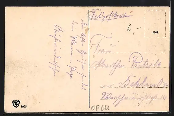 Personenbezogene Daten auf der Rückseite der Karte wurden durch blauen Textmarker unkenntlich gemacht. Die blauen Stellen sind auf die Vorderseite durchgeweicht und wirken sich negativ auf das Postkartenfoto aus